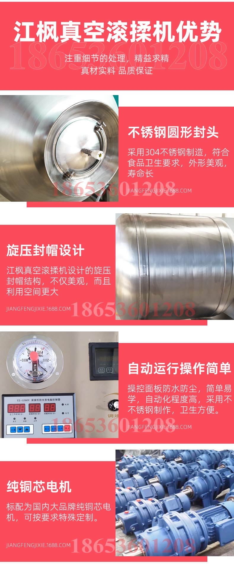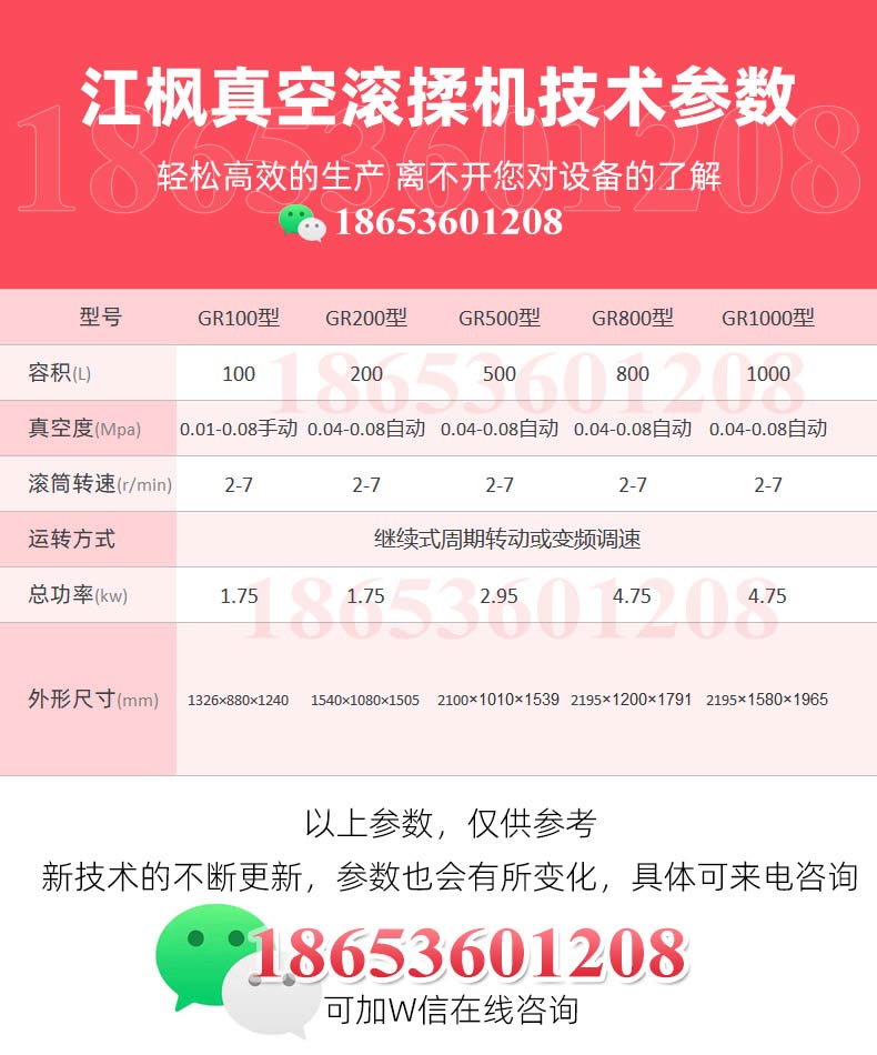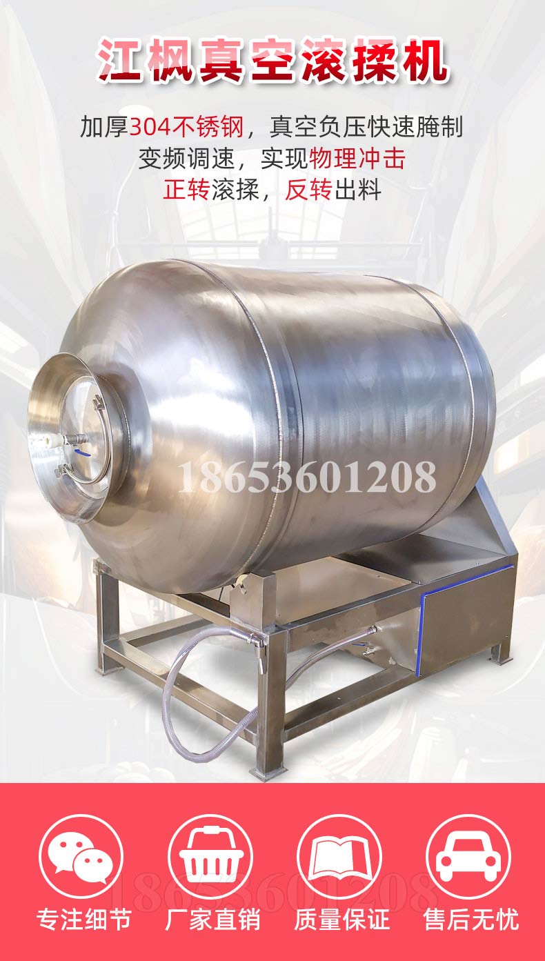 江枫真空滚揉机可以使肉均匀的吸收腌渍,可以提高肉的结着力及产品的弹性;可以提高产品的口感及断面效果;可以增强保水性,增加出品率;可以改善产品的内部结构,节能高效。整机采用不锈钢制造,结构紧凑,滚筒两端均采用旋压式封帽结构,[-]大的增加滚筒内的摔打空间,使滚揉产品的效果均匀,噪音小,性能可靠,操作简便,使用效率更高。